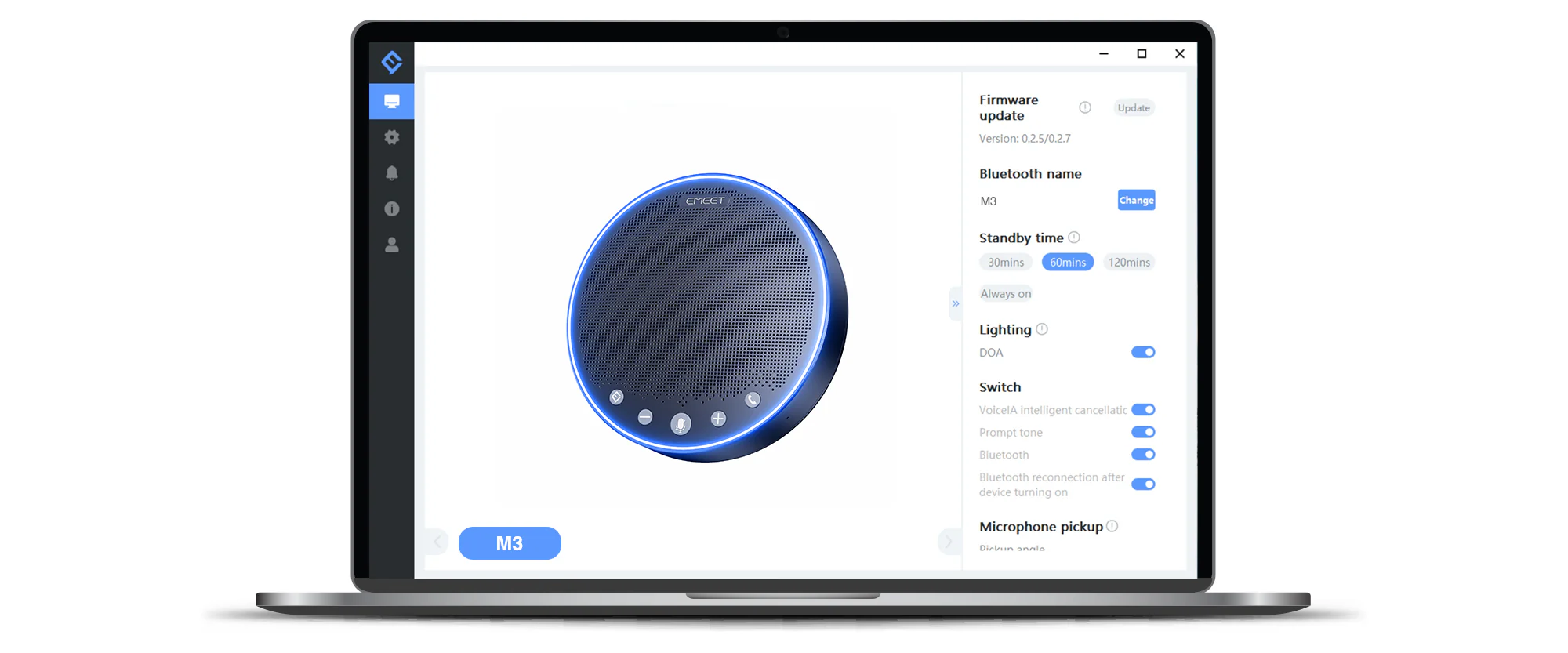 Works with EMEETLINK for PC. Adjust the standby time of the device, change the Bluetooth name or upgrade the firmware to continuously improve the device and let it get smarter, all available in our exclusive software EMEETLINK.