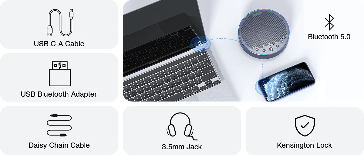 M3 offers various connection methods for you to choose from, including USB-C that enables auto power on, USB adapter A300, 3.5mm Jack and Bluetooth for 2 devices simultaneously, all of which provide a stable and reliable connection. Choose the one that suits you the best and launch meetings right away.