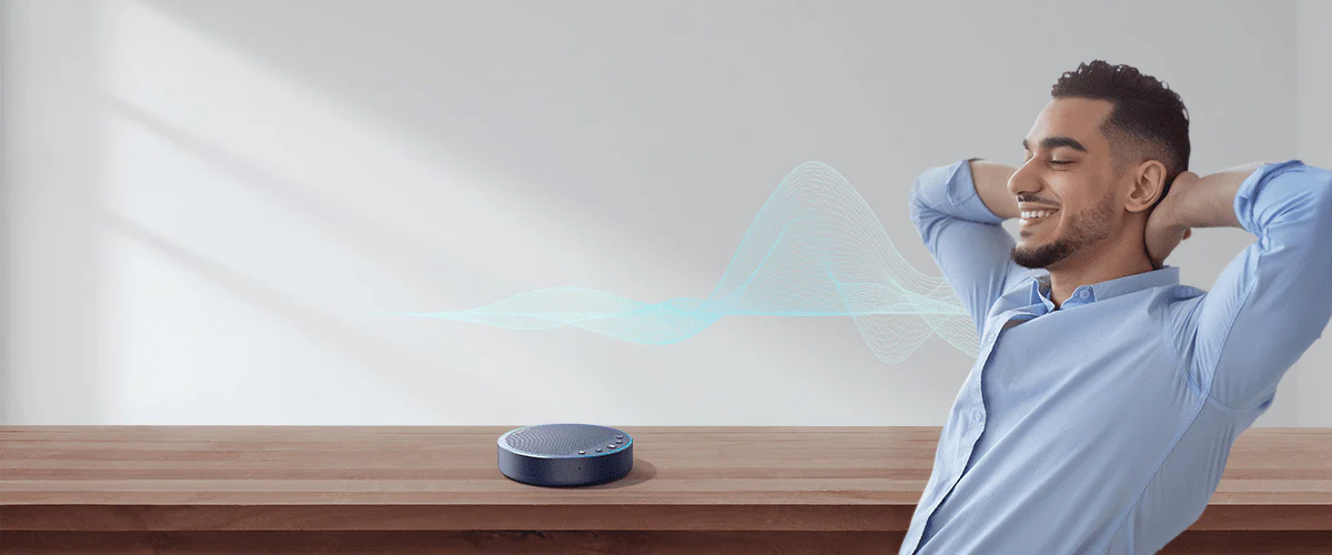 Built with a composite diaphragm and an independent speaker cavity, this 5W, 45mm speaker features an auto switch between conference mode for crystal-clear human voice and music mode for Hi-Fi sound with thick low frequency and penetrating treble, relaying every detail, and every rhyme to your ears without distortion.
