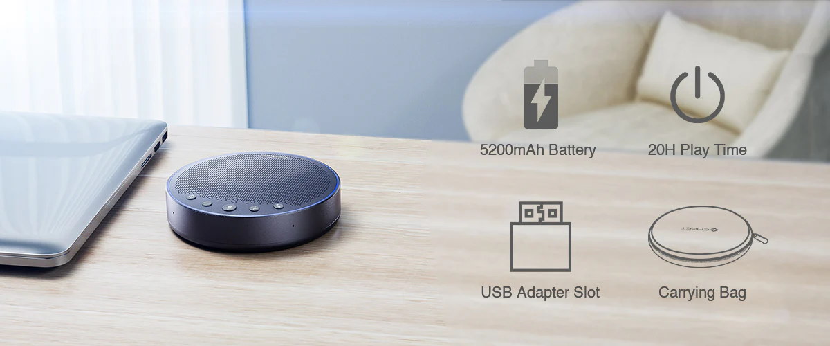 2022 Reddot winner with 360° voice pickup and positioning with ring light, latest VoiceIA®4.2 audio algorithm, initiated suspended mic cavity, 5W speaker and 20-hour long-lasting battery life, ideal for small to medium meeting rooms and work from anywhere.