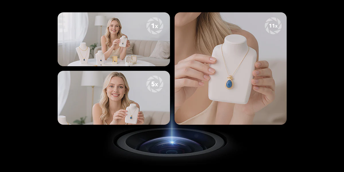 With the 11x hybrid zoom, you can easily zoom in for product presentation from afar. No need to come closer to the camera.